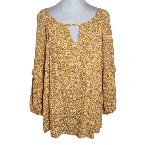 This West Kei orange floral blouse brings a bright, feminine touch with an easy, flowy feel. Designed with 3/4 length sleeves, it features a ruffle sleeve accent and a cutout at the neckline for added interest. New without tags, it’s a great piece for dressing up jeans or pairing with skirts for a polished everyday look.