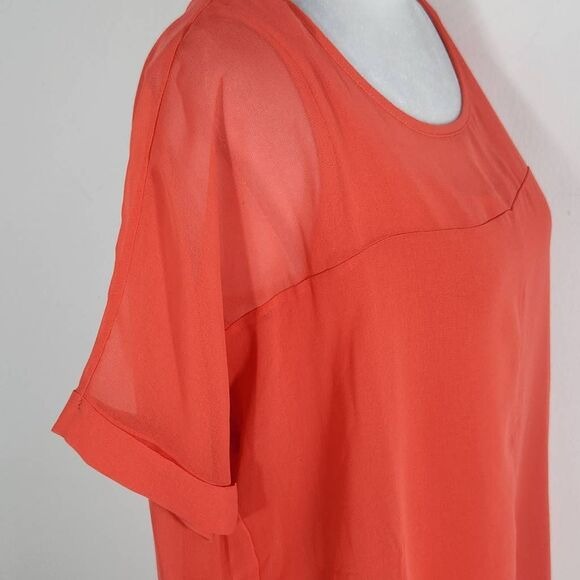 Add a pop of color with this Worthington coral short-sleeve top featuring a sheer overlay with a lined body and a stylish lace-up back. Lightweight and comfortable, it’s perfect for casual or dressy occasions. Size Small and new with tags (NWT).